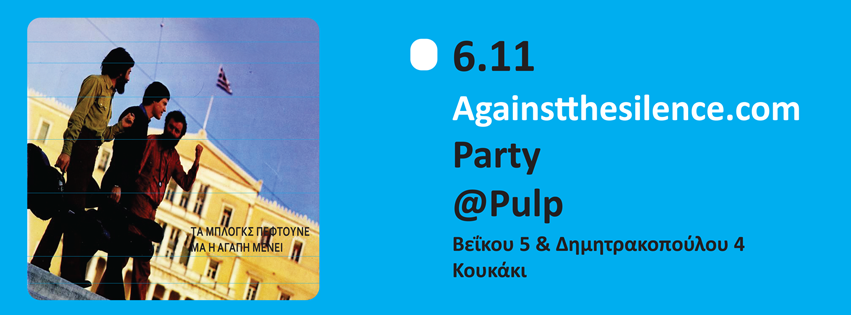 Μια βραδιά που θα περιλαμβάνει μουσικές επιλογές τεσσάρων μελών της ομάδας του againstthesilence. Θα υπάρχουν επίσης συλλεκτικές αφίσες και συλλεκτικές κασέτες με το εξώφυλλο της τελευταίας μας συλλογής. Κι επειδή τα πολλά λόγια είναι φτώχεια, σας περιμένουμε στο Pulp, Βεΐκου5 & Δημητρακοπούλου 4 στο Κουκάκι, αύριο στις 21.00.