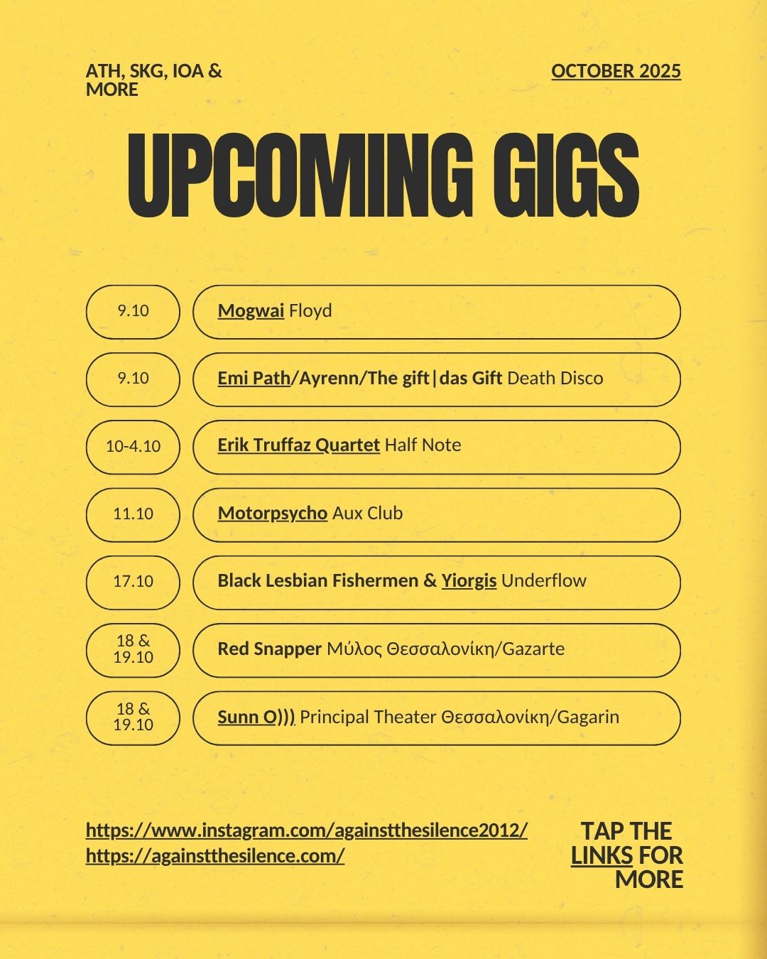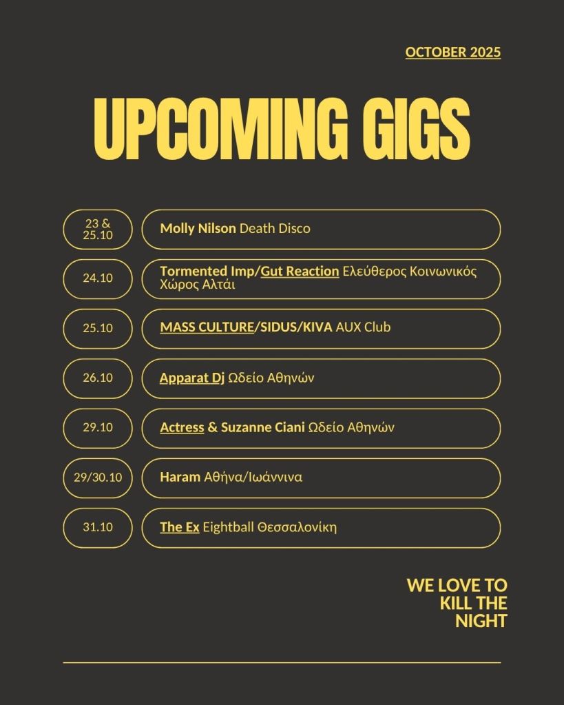 Το ζήτημα των συναυλιών είναι ζωτικό για την ίδια τη μουσική. Θυμίζει τη σημασία των διαδηλώσεων πάνω στην ουσία της πολιτικής (της ουσιαστικής έννοιας, όχι της κατανάλωσης της), χωρίς αυτές δεν νοείται πολιτική δήλωση. Πάνω σε αυτή τη βάση δεν είναι όλες οι συναυλίες ή τα φεστιβάλ το ίδιο, ασχέτως αν έχουν την δική τους ταυτότητα ή πολιτικότητα. Αναδεικνύοντας, λοιπόν, αυτές που πραγματοποιούνται στον ελλαδικό χώρο και κρίνουμε αξιόλογες θα προσπαθήσουμε από αυτό το μήνα να ανεβάζουμε έγκαιρα ένα πλάνο των βραδιών αυτών, καθώς η συμπερίληψη τους στο ATS έντυπο κάπως τις “υποτιμούσε”.