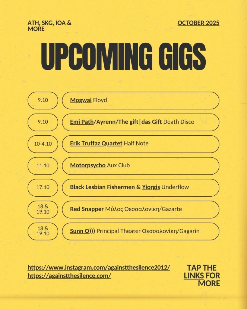 Προφανώς, δεν θα ασχοληθούμε καθόλου με φεστιβάλ μπέργκερ, φέτας ή άλλων προϊόντων που διακατέχονται από μια καταναλωτική μανία, ούτε με ναρκισσιστικές περσόνες που κουράζουν. Επίσης, προφανώς, θα υπάρχουν κενά στα ενημερωτικά αυτά δελτία, οπότε και ζητάμε να μην εξαντλήσετε αμέσως την όποια αυστηρότητα σας, αλλά να βοηθήσετε στέλνοντας πληροφορίες για συναυλίες επόμενων μηνών. Ακολουθεί το δισέλιδο δελτίο όπου μπορείτε στα υπογεγραμμένα link να διαβάσετε και να ακούσετε δείγματα των αντίστοιχων μουσικών ονομάτων.