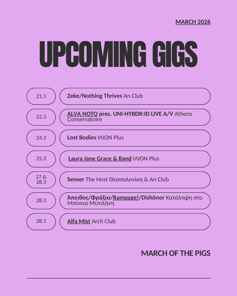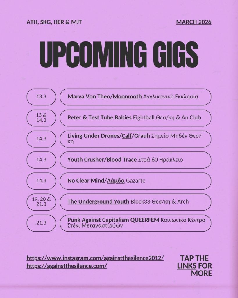 Καλό μήνα με τον αναμενόμενο ερχομό της άνοιξης να ανοίγει το καλειδοσκόπιο των αξιοπρόσεκτων συναυλιών. Στα υπογεγραμμένα link θα βρείτε τα κείμενα μας σχετικά με τα αντίστοιχα ονόματα. Παρατηρήσεις, σχόλια ή επισημάνσεις μπορείτε να μας στέλνετε στο againstsilence@gmail.com.