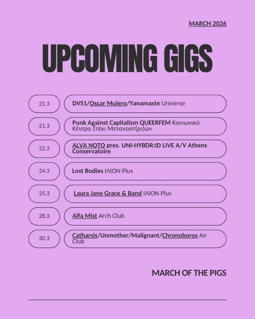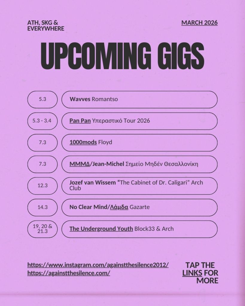 Καλό μήνα με τον αναμενόμενο ερχομό της άνοιξης να ανοίγει το καλειδοσκόπιο των αξιοπρόσεκτων συναυλιών. Στα υπογεγραμμένα link θα βρείτε τα κείμενα μας σχετικά με τα αντίστοιχα ονόματα. Παρατηρήσεις, σχόλια ή επισημάνσεις μπορείτε να μας στέλνετε στο againstsilence@gmail.com.